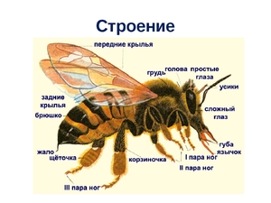 Внешнее строение тела пчелы включает в себя следующие части: