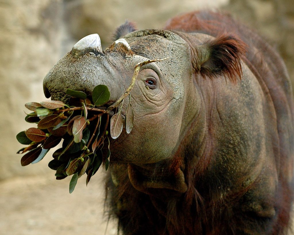 А так же суматранский носорог обожает сладкие и сочные фрукты, такие как манго, бананы и инжир. Из травяных растений носорог любит питаться семейством крапивных. Кормятся суматранские носороги чаще всего неподалеку от водоема или леса. Для добывания растительной пищи, животное использует свой рог, так как рук не имеет. А так же рогом животное ломает ветки деревьев, после кидает их на землю и разделяет при помощи ног.